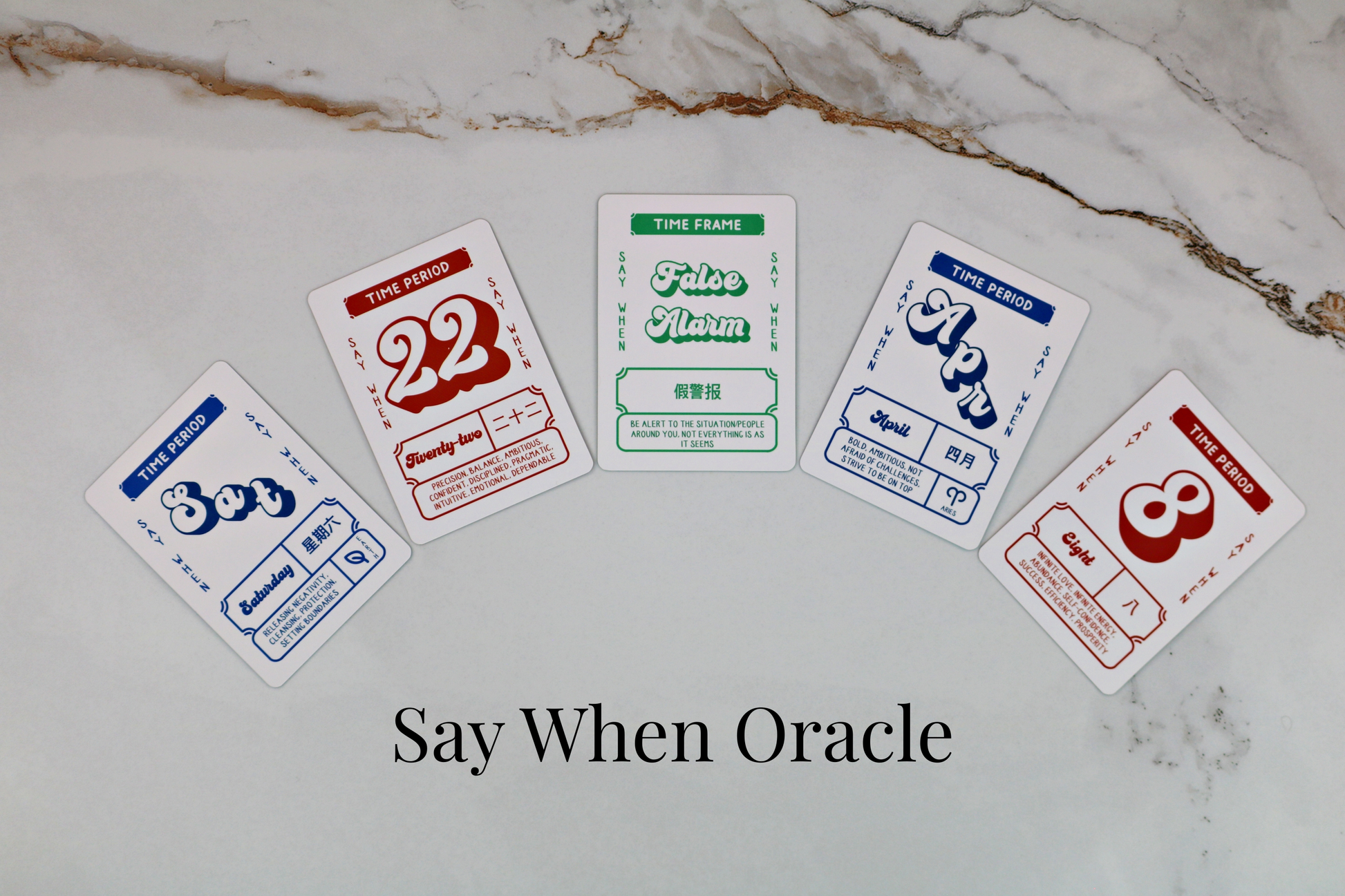 - Say When Oracle -- This deck has a variety of time frame cards. Cards like dates 1-31, days of the week, times of day, seasons, etc.