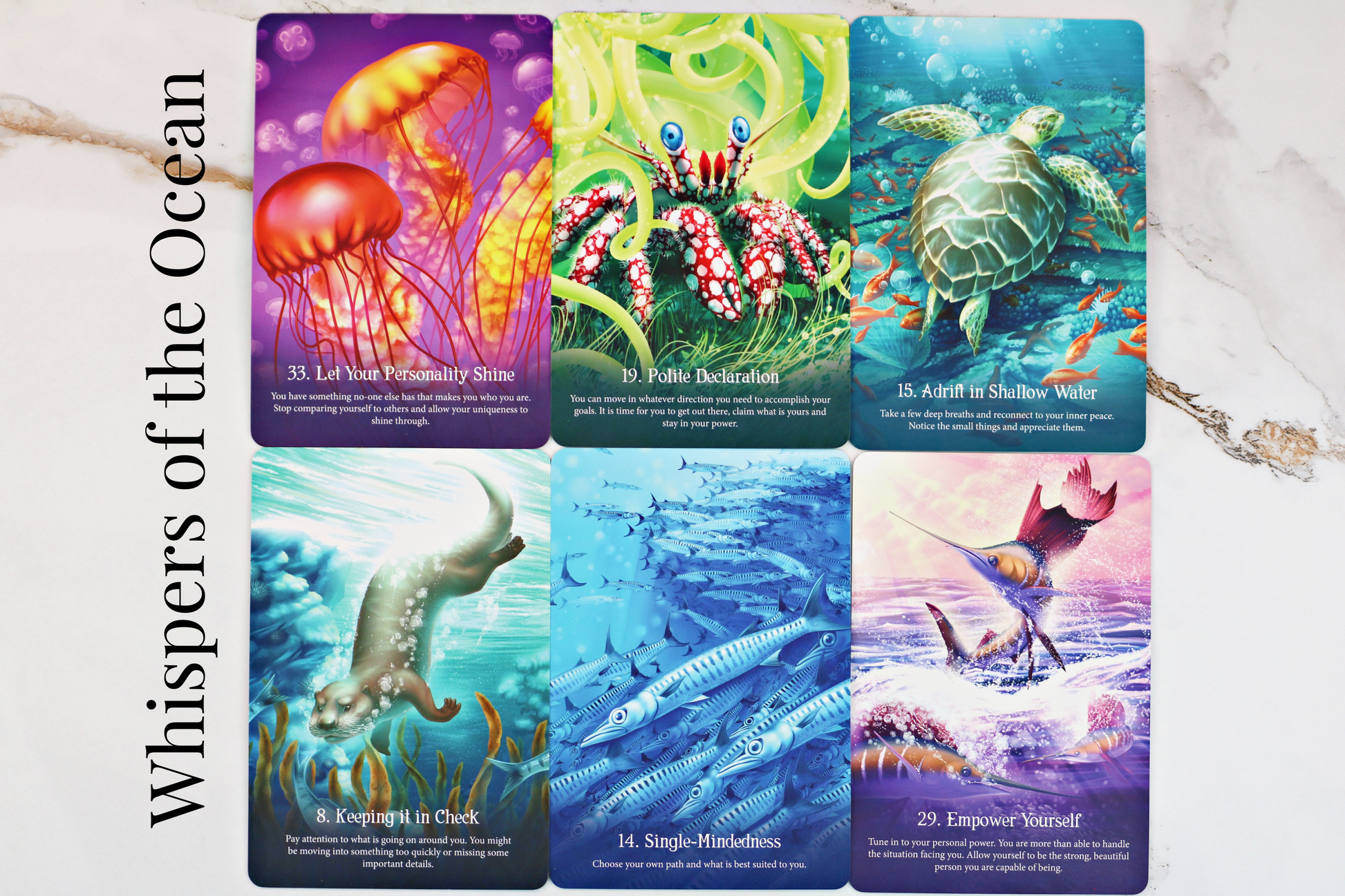 Whispers of the Ocean Oracle -- This deck is perfect for receiving emotional clarity, utilizing intuition, and navigating change. The artworks combines habits and behaviors of specific ocean animals, and translates it into wisdom for how you can best approach your current energy.